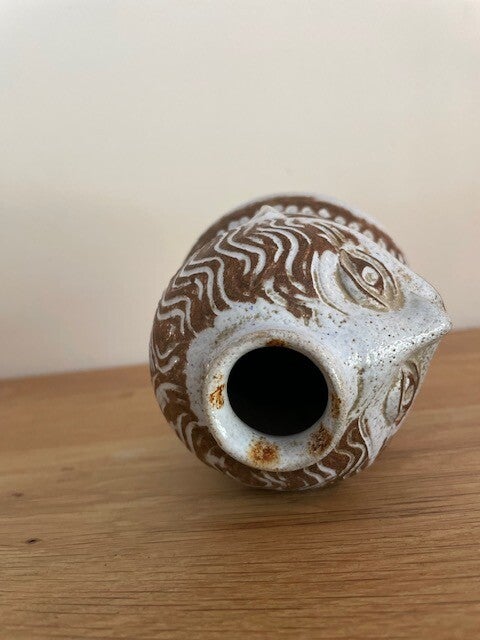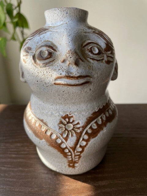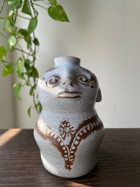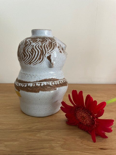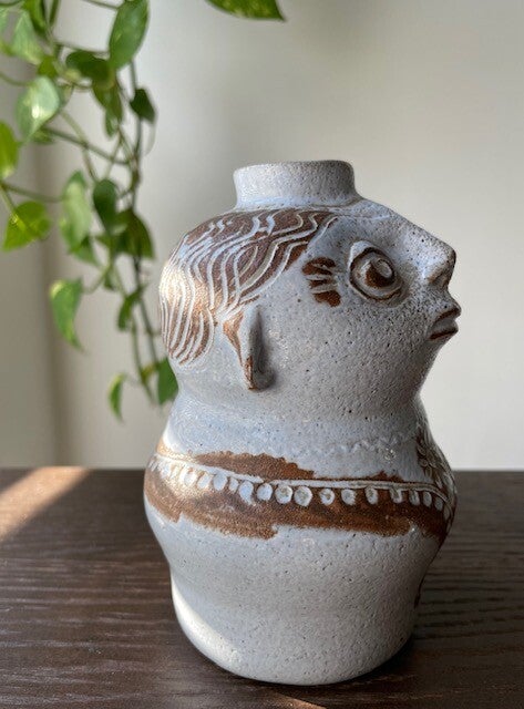 Hele toffe (en mooi gemaakte!) antropomorf vintage vaas in zachtgrijs met espressokleurige accenten. Dit vaasje doet ons een beetje denken aan het werk van keramiek genieën Jacques Pouchain of werk van Norbert Pierlot. Ennn.. eigenlijk ook wel een beetje aan de genie in the bottle uit het sprookje Alladin.