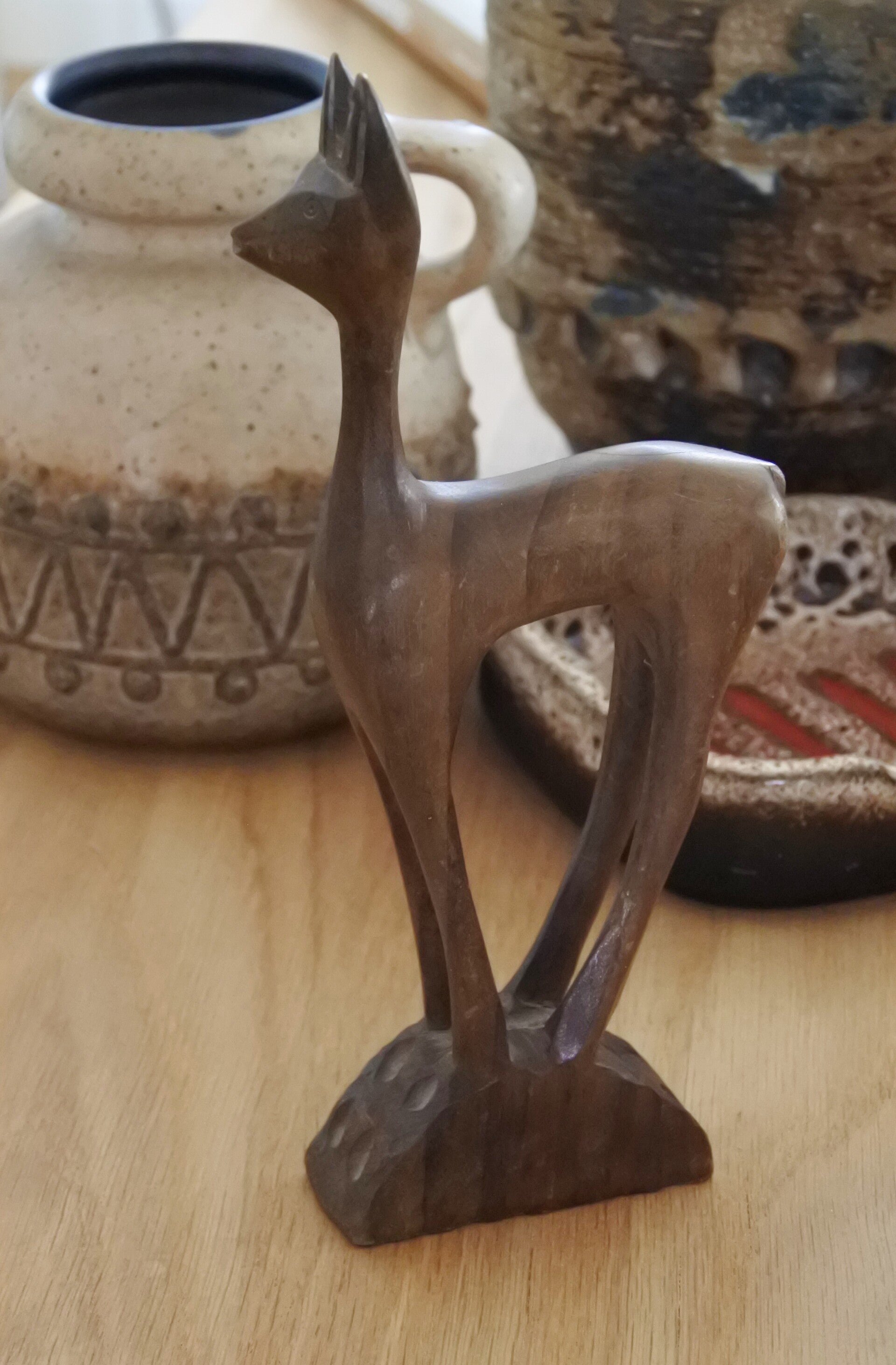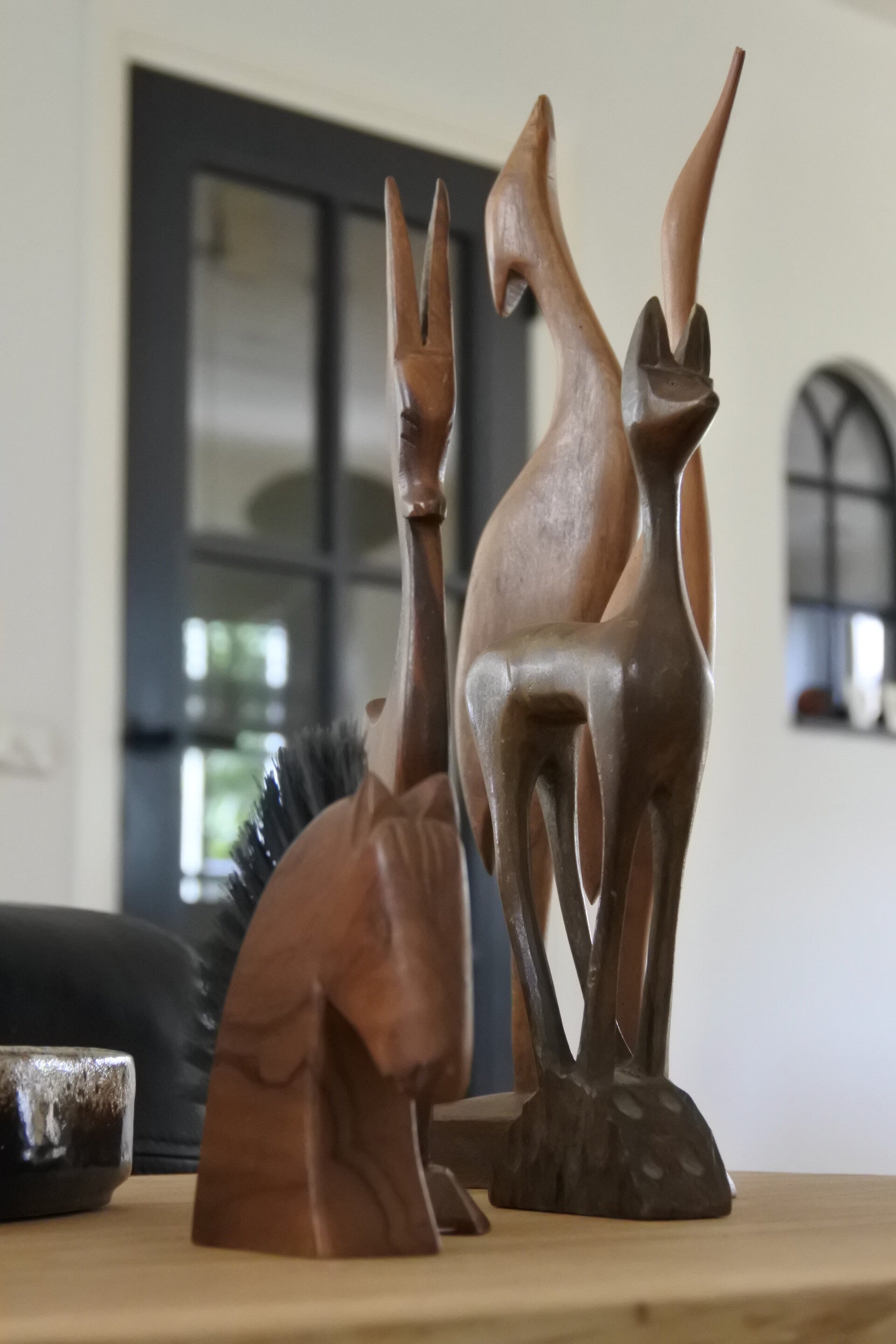 Dit mooie vintage beeldje van hout beeld een hertje uit op een voetstuk. En dat is wel een mooie en terechte plek om op te staan als je zo'n mooi beestje bent!