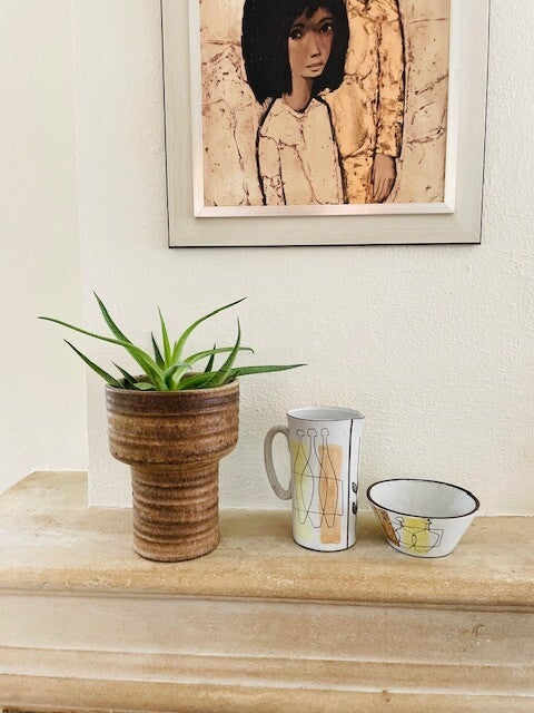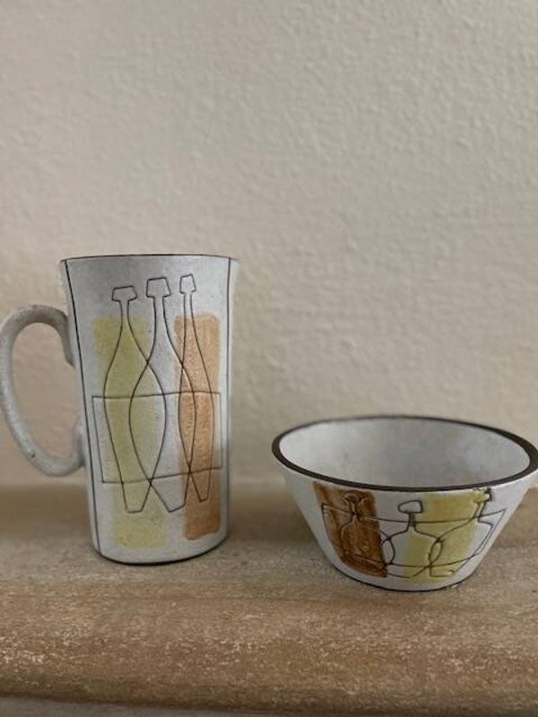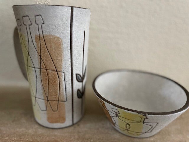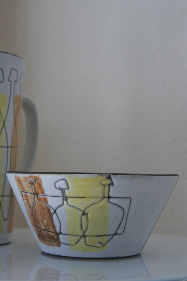 Prachtige schaal en schenkpitcher van 'hollands design trots' Potterie van Werkhooven. Deze zeldzame stukken kom je helaas niet vaak tegen (en geloof ons maar.. we zoeken ons een ons) maar ineens stond deze set voor onze neus, blij dat we waren! De schaal hoort oorspronkelijk bij een pindaset en bij de pitcher ook nog bekers maar dat maakt deze set extra leuk want jouw persoonlijke zoektocht naar het verzamelen van de hele collectie start namelijk vandaag!