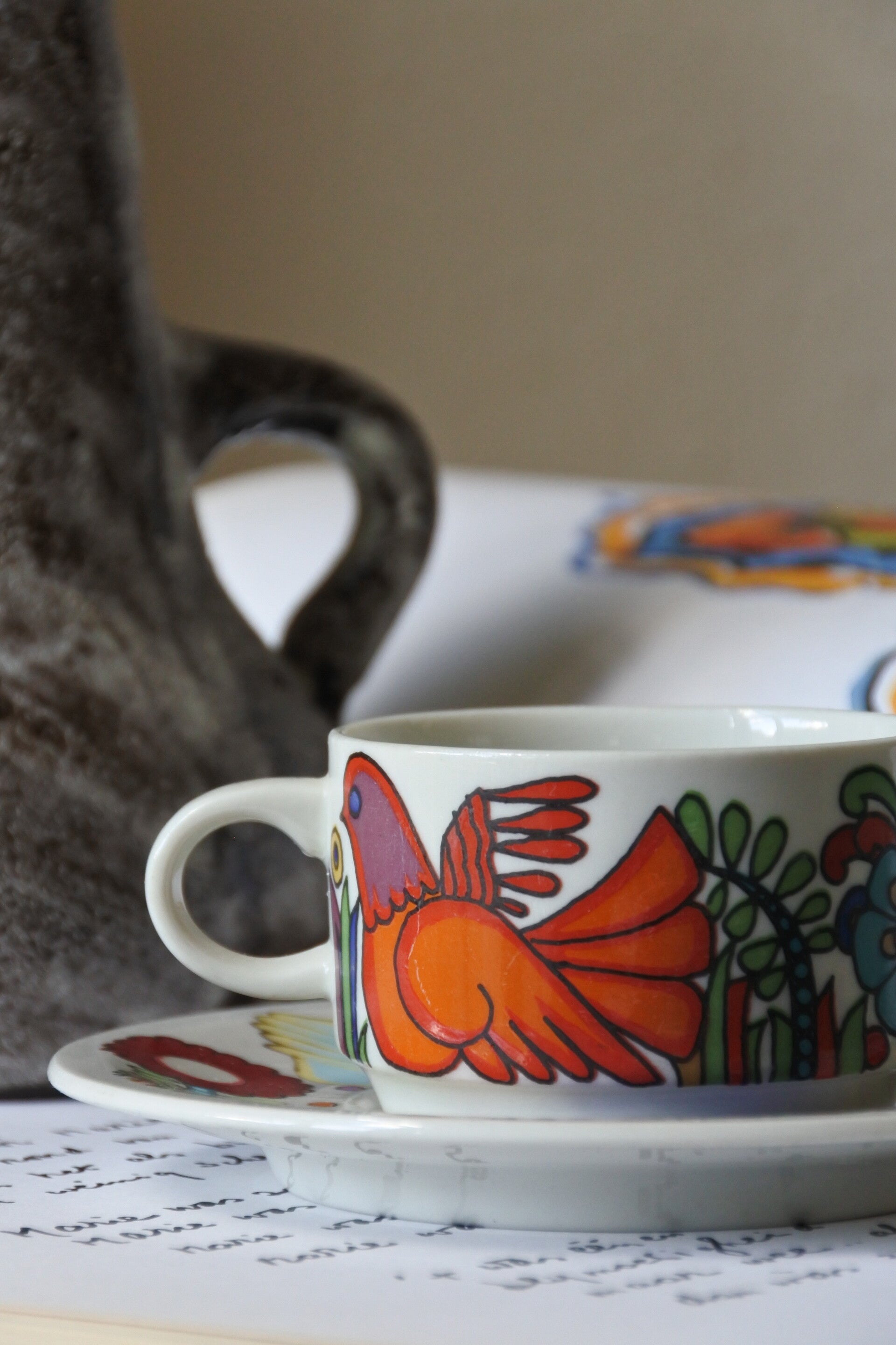 Mooie vintage kop en schotel voor espresso (of een klein koffietje) met funky kleuren en decor van Villeroy & Boch uit de serie Acapulco. Ontworpen door Christine Reuter en exclusief vervaardigd door Villeroy & Boch Luxemburg, werd Acapulco geïnspireerd op een reis naar Mexico. Oorspronkelijk geïntroduceerd in 1967, is Acapulco uitgegroeid tot een van de meest verzamelde serviezen uit de moderne geschiedenis.