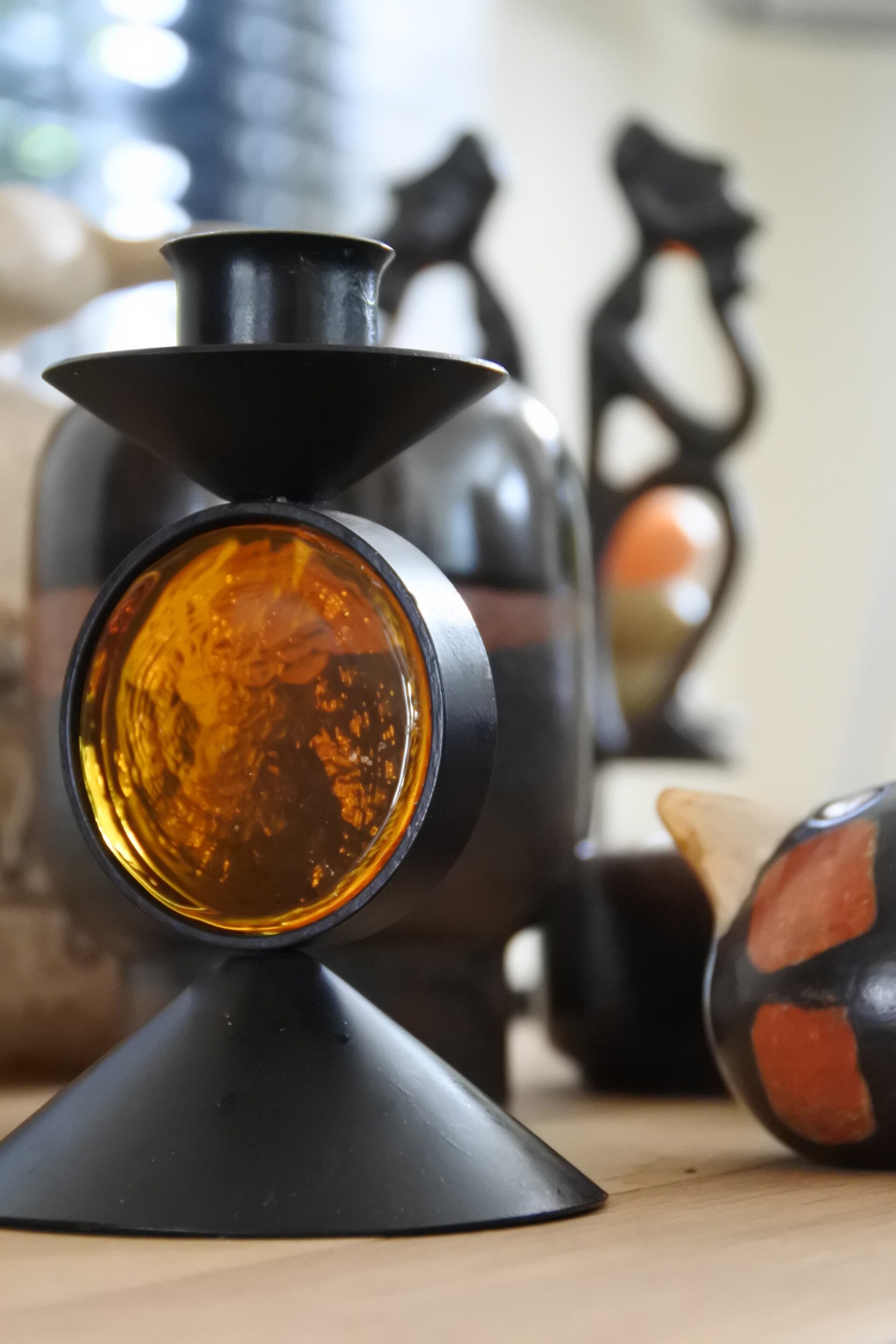 De metalen kandelaar heeft in het midden een amberkleurige glazen schijf die prachtig doorschijnt in het zonlicht.