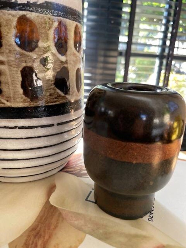 Dit prachtige potje en/of vaasje is een echte hersenkraker voor ons want on-vind-baar. Het zou een pot kunnen zijn maar ook een vaasje, gezien het tekentje aan de onderkant vermoeden we Japans design maar het blijft een mysterie (voor nu!). Wat er niet zo mysterieus aan is.. of hij mooi is, want dat is dit kunstig vervaardigde item met prachtige kleurnuances zeker!