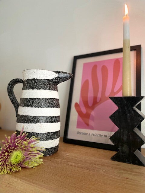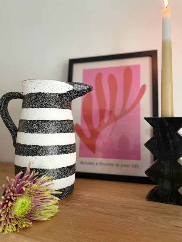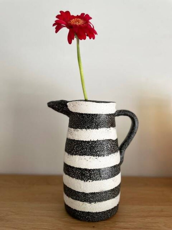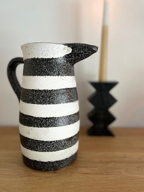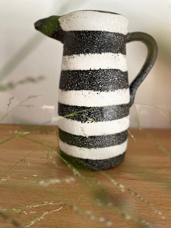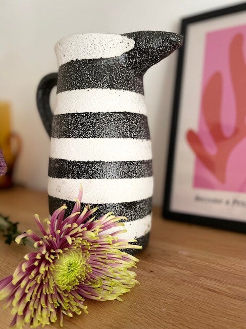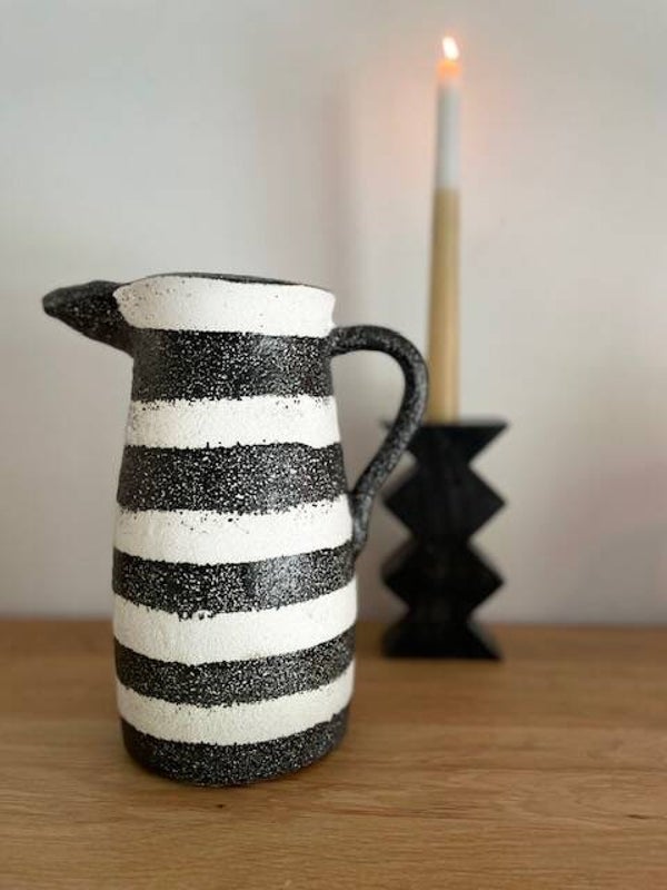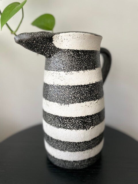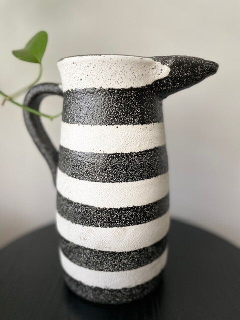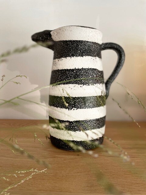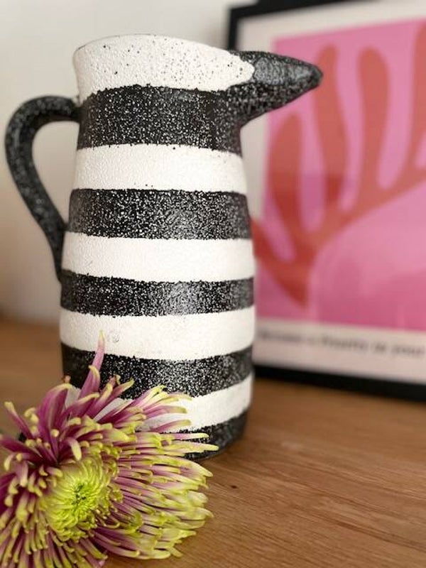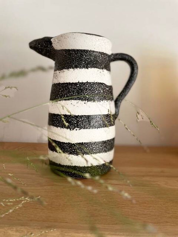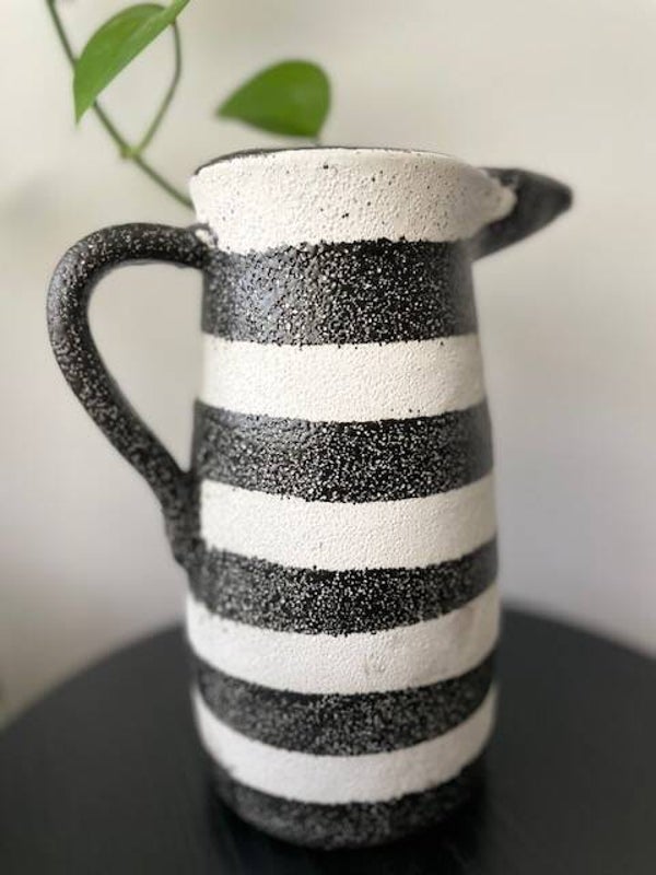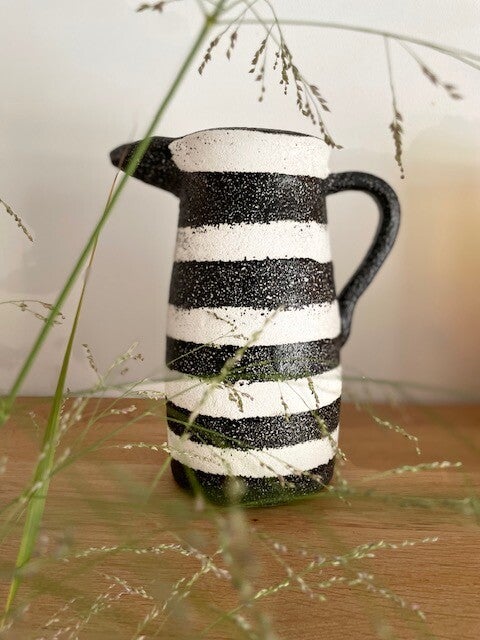 Deze stoere en robuuste zwart-wit geverfde karaf/vaas staat te gek op elke keukenplank, salontafel of als vaas op tafel met een paar mooie bloemen erin. Opties genoeg met deze leukerd!
