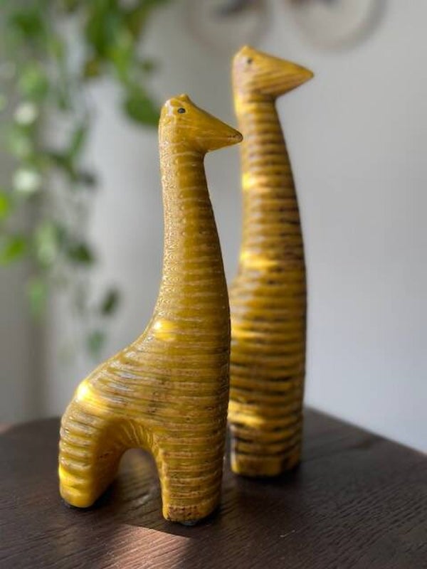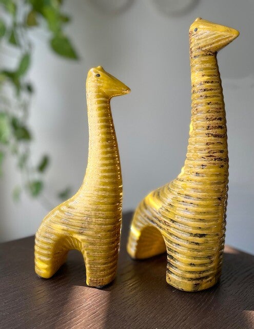 Deze mooie set vintage Mid Century Modern giraffes viel ons meteen op.. de te gekke kleur, de strakke vormgeving, de lieve koppies. Dit is echt zo'n set, die was 30 jaar geleden al charmant en is dat over nog eens 30 jaar ook nog!