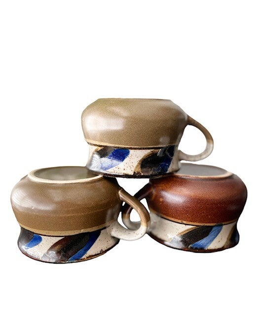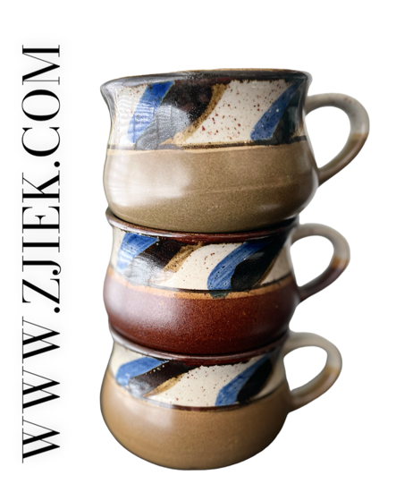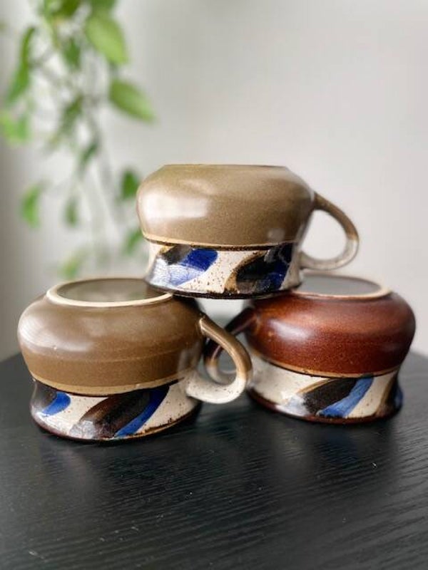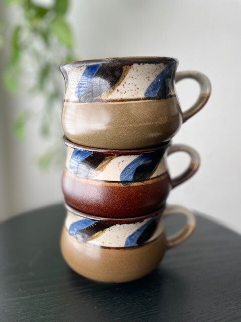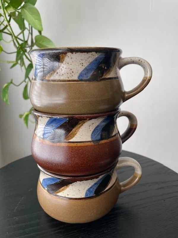 Leuke set van 3 vintage soepkommen met oor en mooie gekleurde band boven de kom. Deze set bestaat uit 2 kommen in olijfkleur en 1tje in warm bruine kleur en heeft een beetje die moderne deense look. Heel leuk!