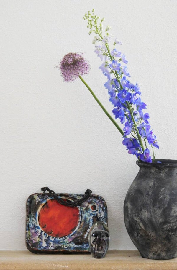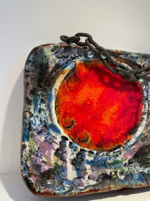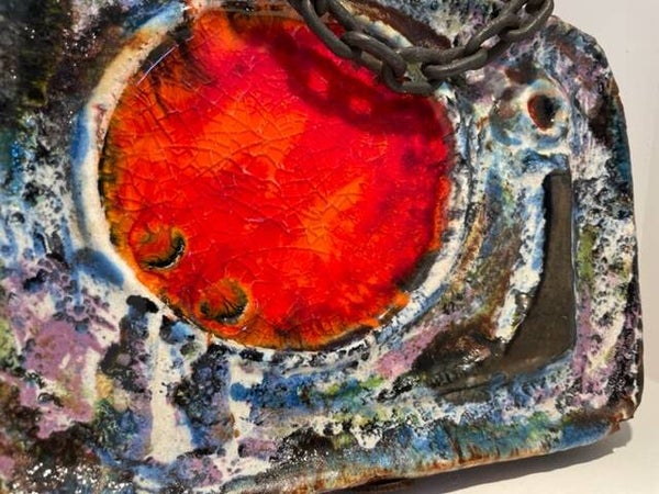 Mooie vintage wandplaquette van Helmut Schäffenacker. Deze plaquette met zijn prachtig kleurgebruik en stoere ketting als (toffe tegen)hanger is een waar stukje speciaal design voor aan de muur!