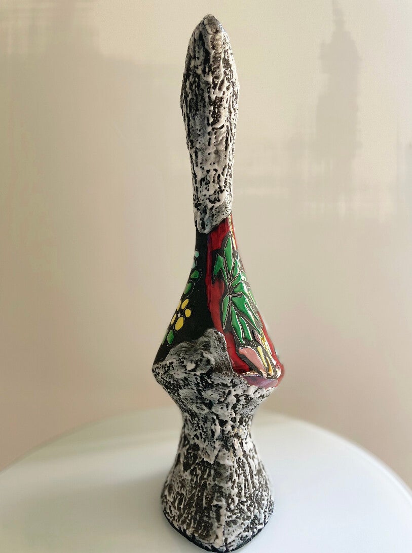 Eigenlijk heeft deze vaas wel vrijwel alles in huis..een te gekke vorm, vet bruisglazuur, een te gek design aan weerszijden en volle kleuren in glazuur opgelegd. Een klein kunstwerkje als je het ons vraagt!