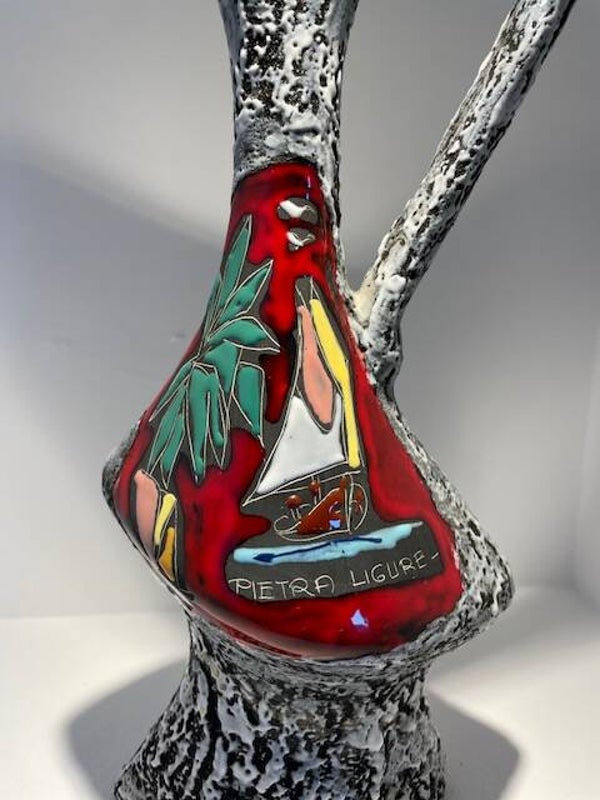 De vaas heeft een handgeschilderde Effetto Lacca (emaille effect) San Marino scène. Verschillende fabrieken in het San Marino-gebied van Italië produceerden keramiek in deze stijl tussen de jaren 1950-1980.