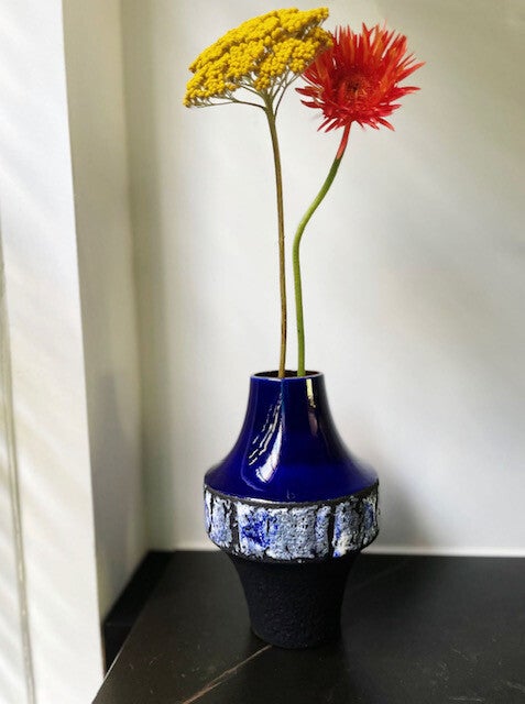 Deze prachtige en zeldzame blauwe vaas van Carstens Tonnieshof Luxusserie is wel een heeeel speciaal model. De vaas is ontworpen door Heinz Siery himself in de jaren 70 en komt uit de serie MALMÖ. De luxusserie werd enkel verkocht bij de mooiere en hogere prijsklasse zaken destijds en door de speciale oplages kregen de modellen uit deze serie een hoog 'wil ik hebben' factor.