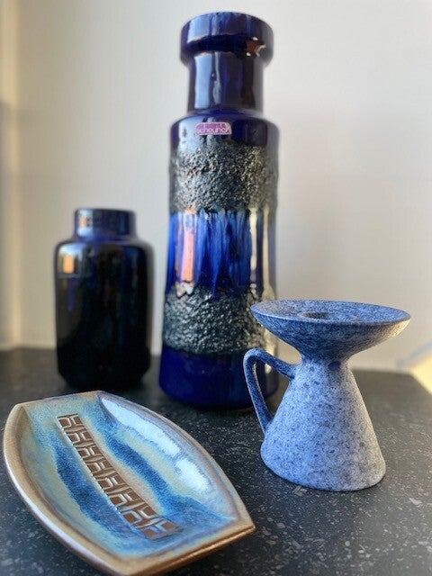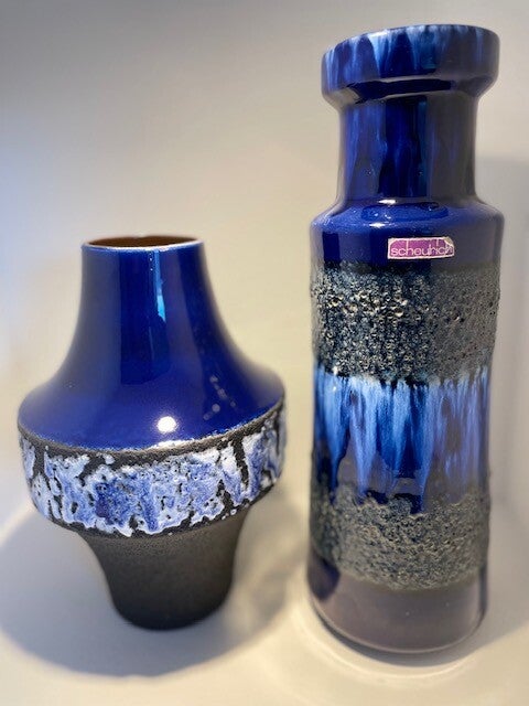 Prachtige Scheurich West Germany vaas in blauwe kleuraccenten, een bruisglazuur band en origineel stickertje.