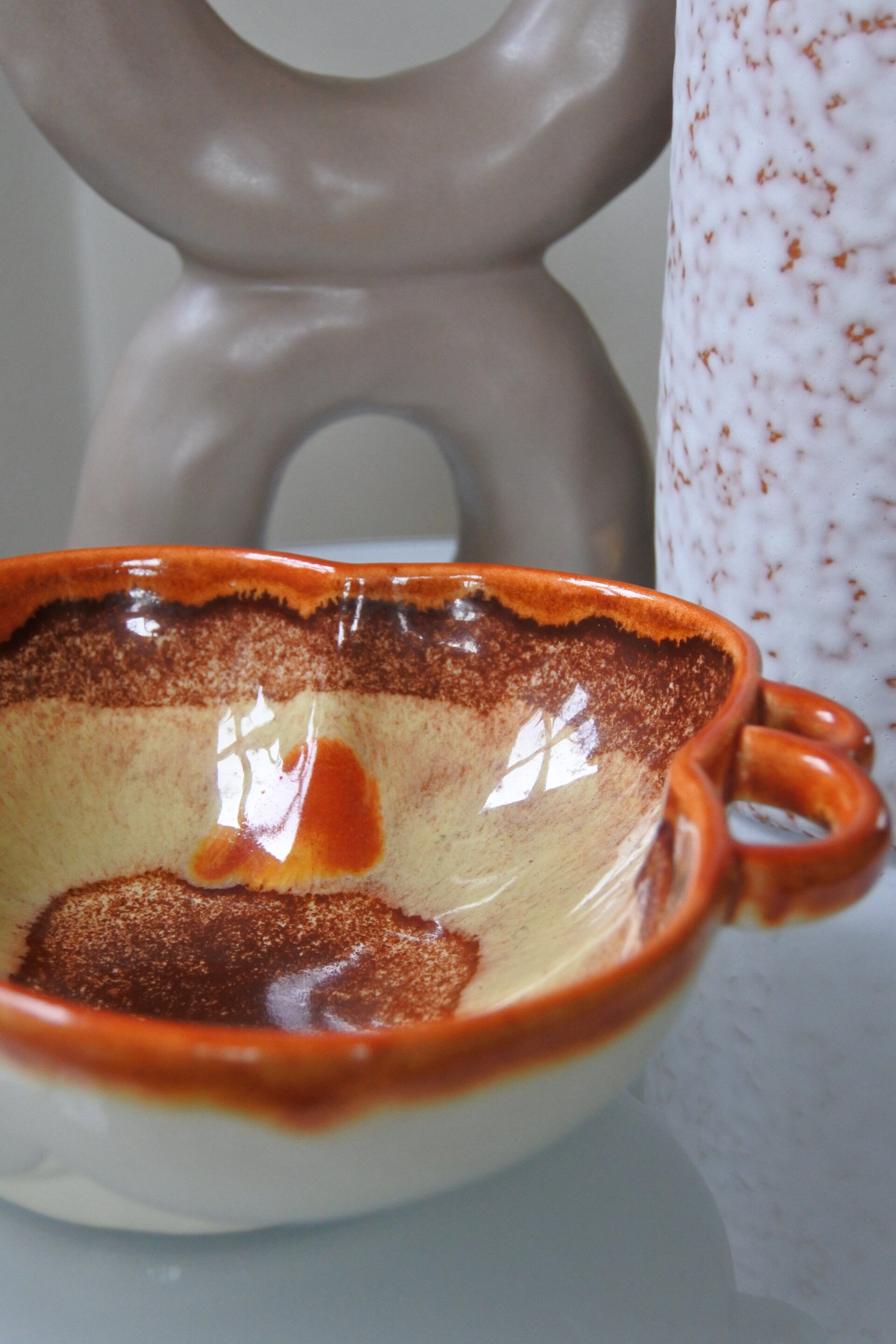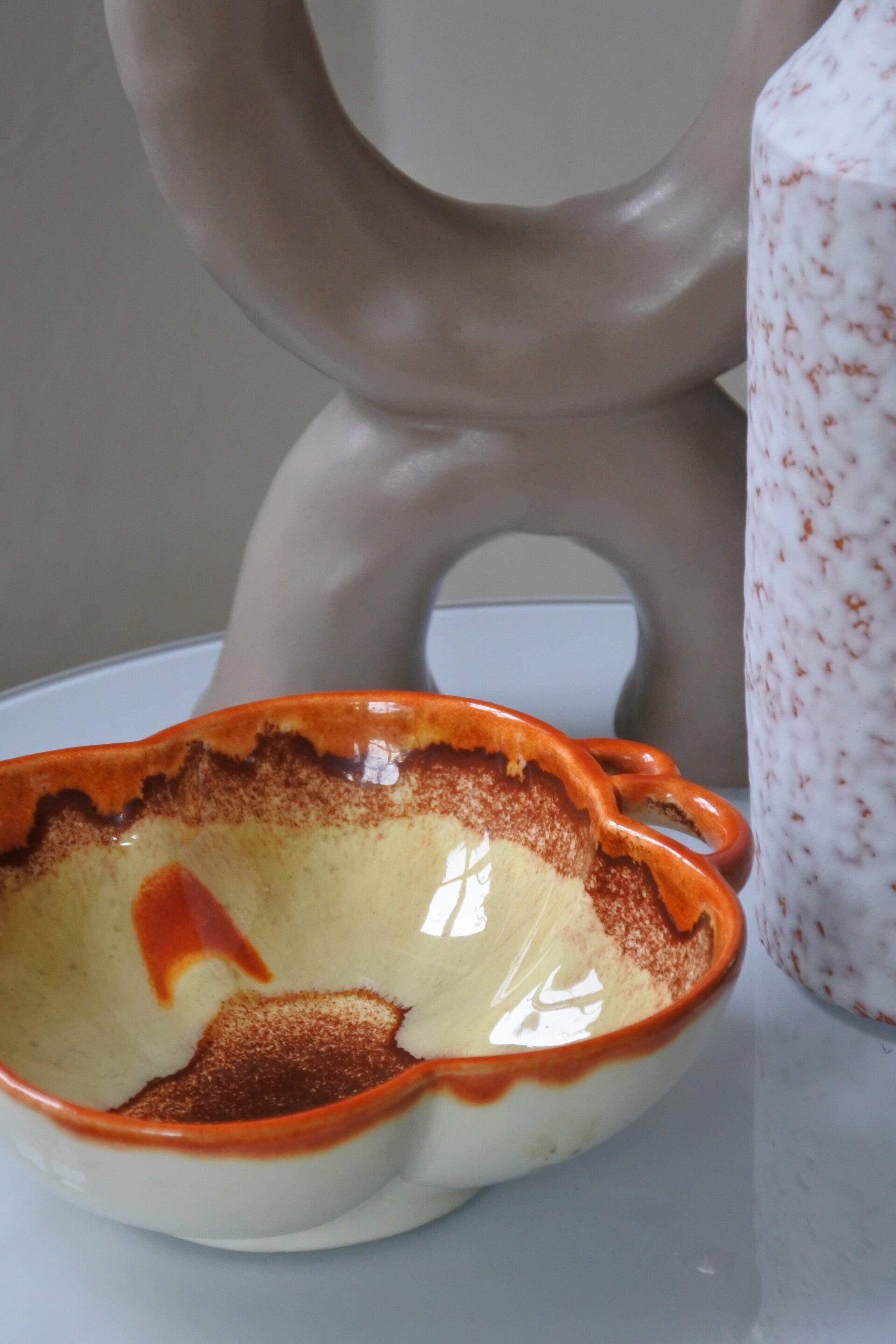 Wat een beauty deze vintage sierschaal met golvend design van Dumler & Breiden West Germany. De schaal heeft een zacht geel-cremekleurige ondergrond met oranje en cognackleurige accenten en aan weerszijden een funky oortje. Mooi als decoratief design stuk in je huis of lekker gebruiken als fruitschaal of iets in serveren op je mooi gedekte tafel. Genoeg opties met deze beauty!