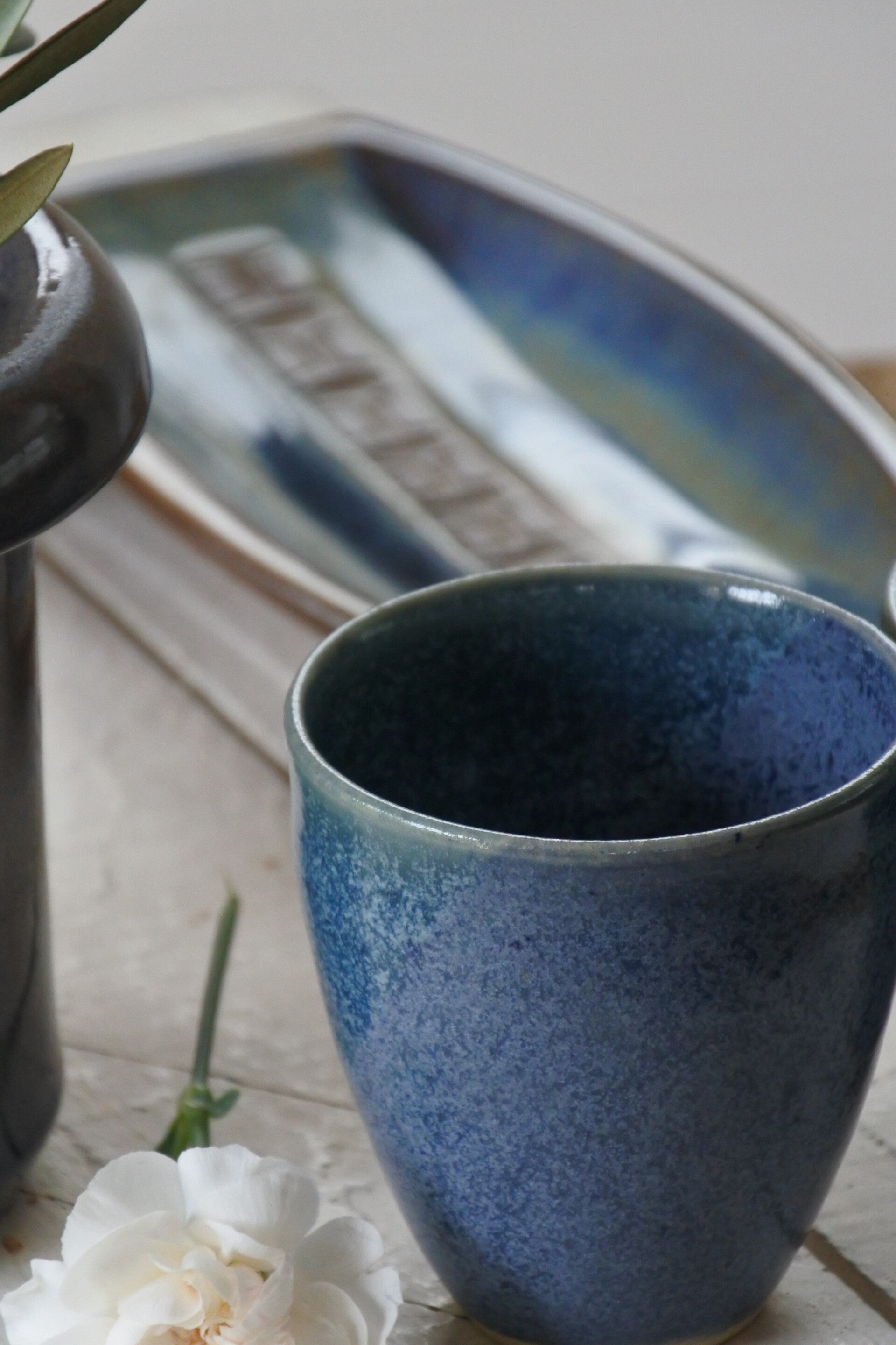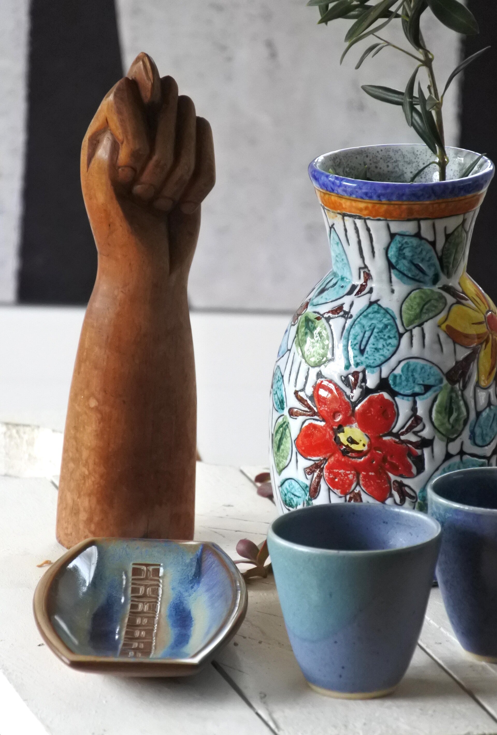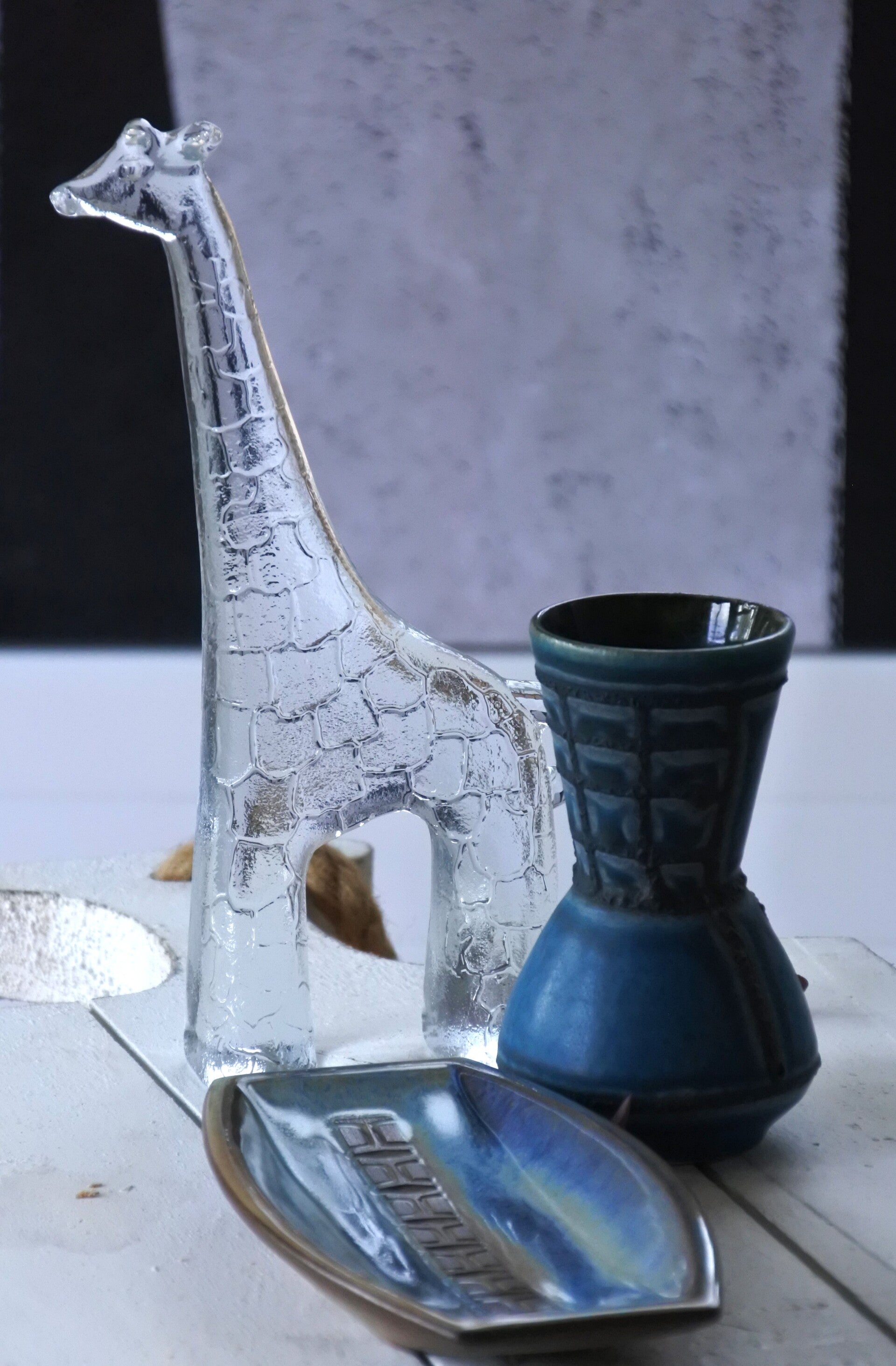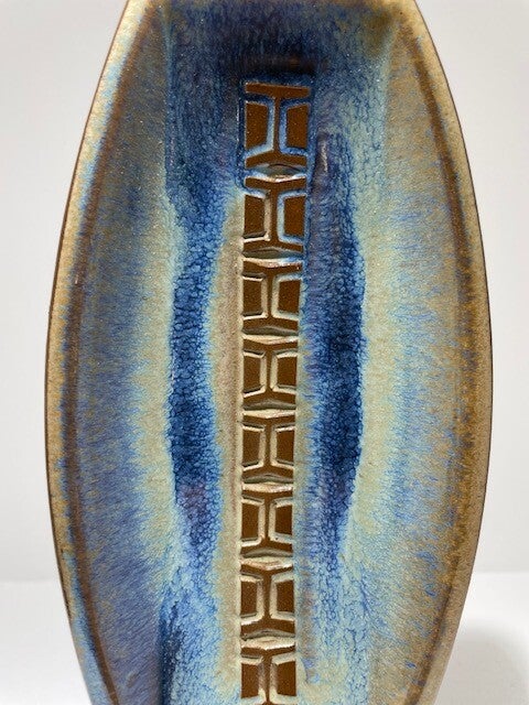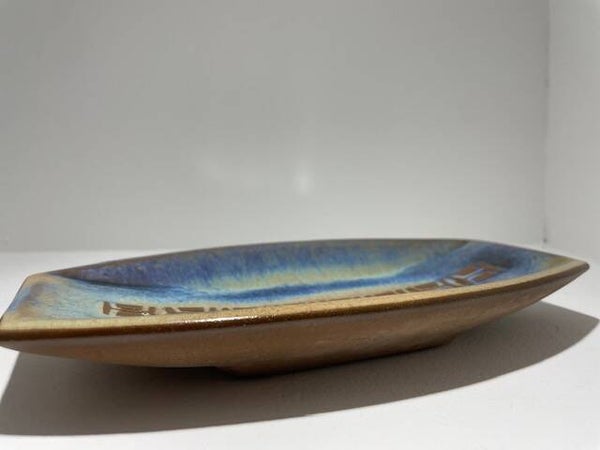 Dit prachtige vintage schaaltje is van het Deense merk Bornholm en zeer bekend onder de vintage design verzamelaars. Het design is van Michael Anderson en draagt serienummer 6025. Het schaaltje heeft een prachtige lichtblauwe ondergrond met donkerblauwe kleurschakeringen en een relief opdruk op de voorzijde.