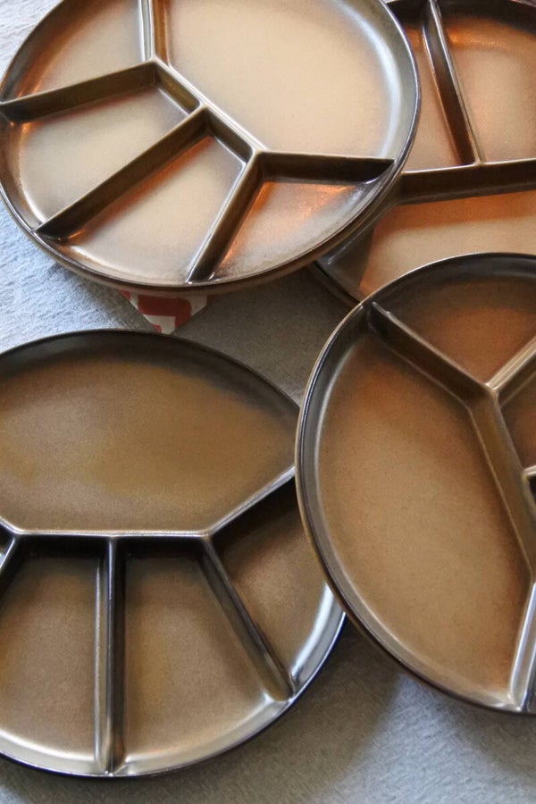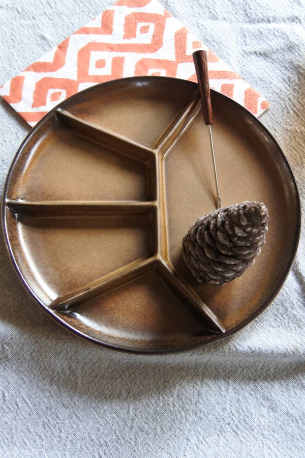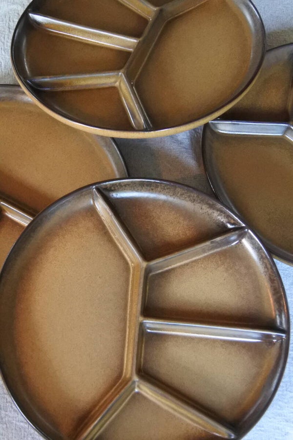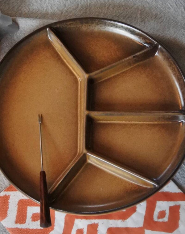 Leuke vintage set gourmet en/of kaasfondue (allebei heeerlijk) bordjes van Gerzit,West Germany in mooie bruine kleur met mooie sierlijke opstaande randen. Eigenlijk heeft ieder huishouden zo'n leuk setje gourmet borden nodig! niet alleen voor dit maar denk ook eens out of the box.. wij gebruiken ze ook als antipasti voorgerecht bordje of om in te zetten als een 1 persoons kaasplateau tussen het hoofd en nagerecht in. Opties genoeg dus!