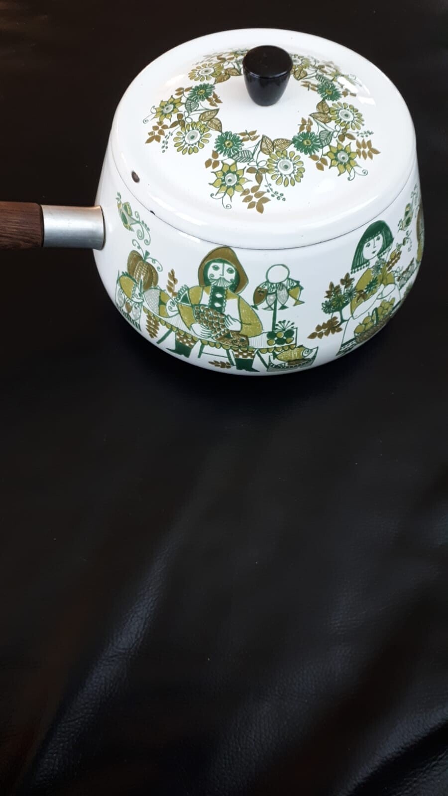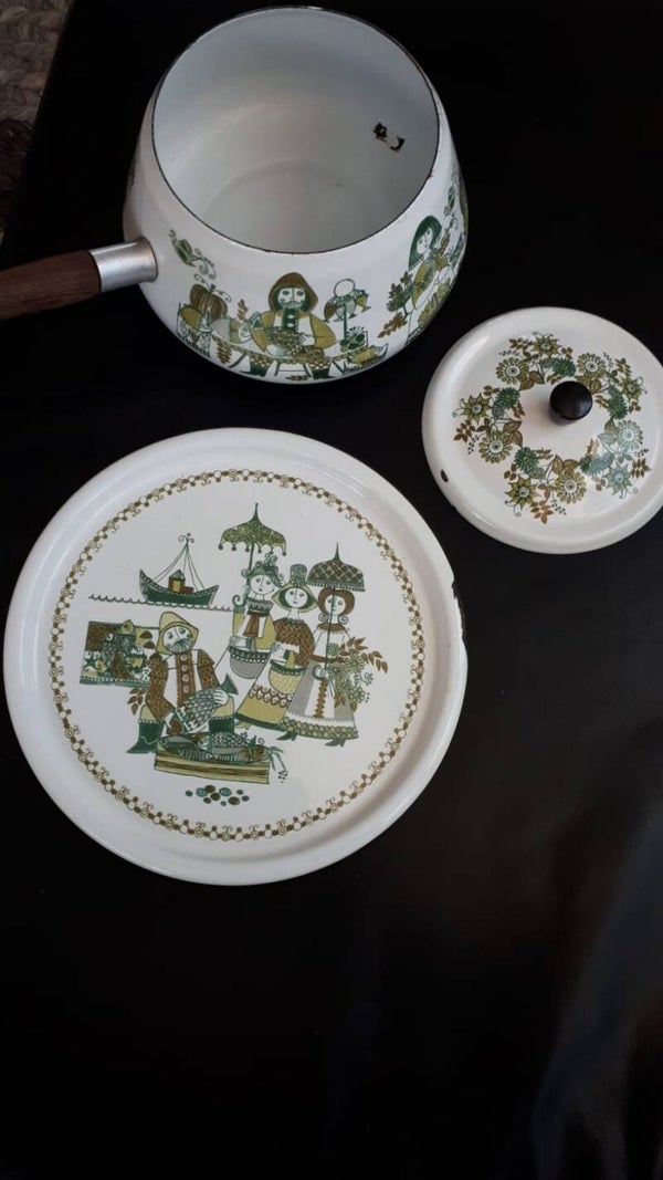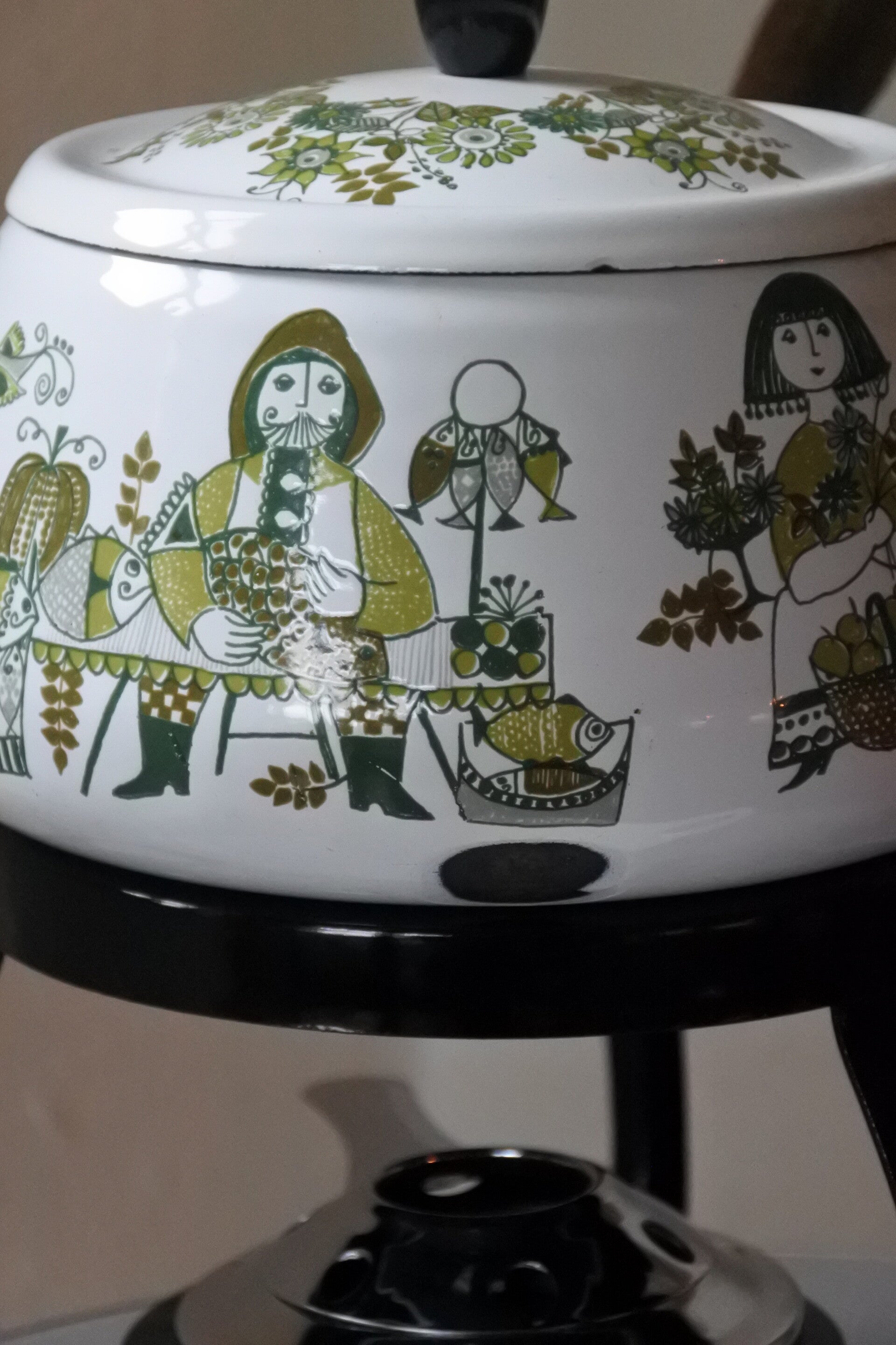 Figgjo Flint Market geëmailleerde fonduepan met het bekende Market Design en houten handvat. De set bestaat uit een fonduepan, een onderstel met bijbehoren (waarvan 1 spiritus bakje door de vorige eigenaar toegevoegd) en een ijbehorende onderplaat.