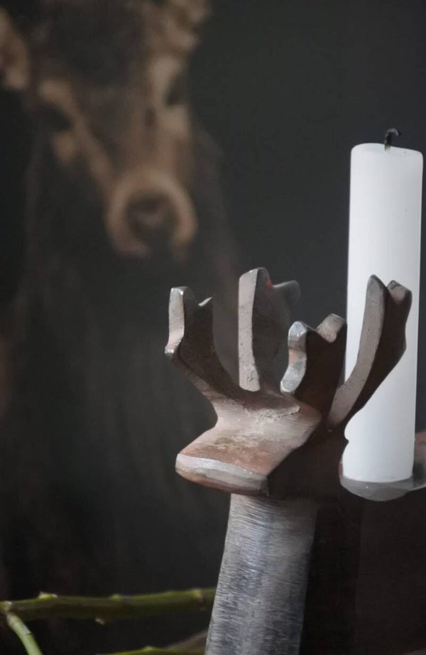 We durven het bijna niet te zeggen maar.. we vinden veel kerst items gewoon niet zo Uhm.. erg leuk. Elk jaar is het weer een zoektocht die op weinig uitloopt maar! Op een of andere manier lopen we altijd wel warm voor elanden en herten. Dat klinkt suf maar deze heule mooie vintage kandelaar van staal is alles behalve suf. Ook na de feestdagen is deze mooie jongen nog heel erg leuk en dat.. vinden wij nou weer leuk! Cirkeltje rond.