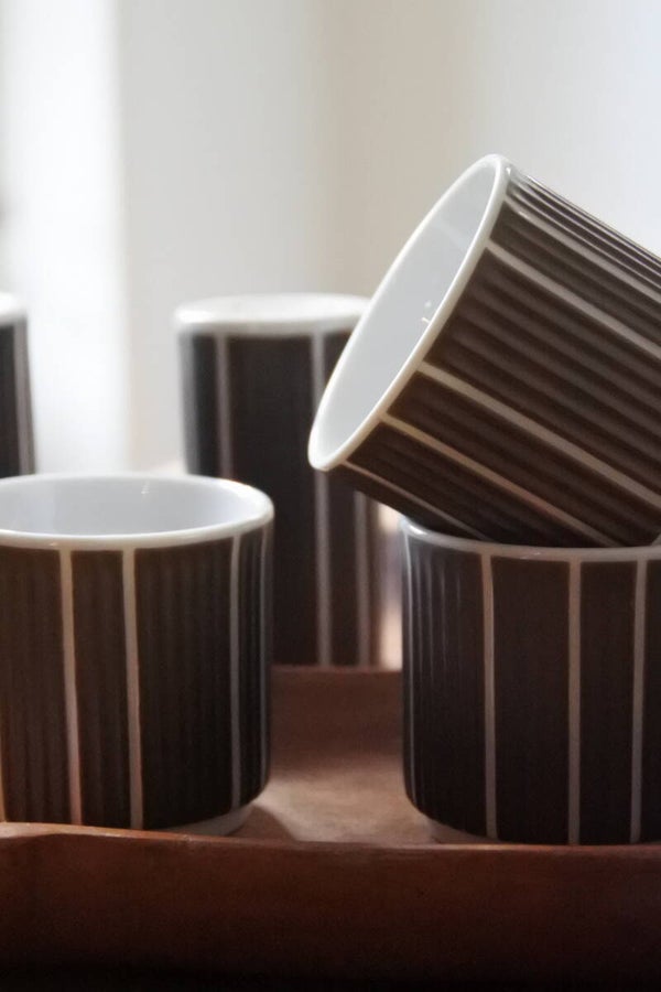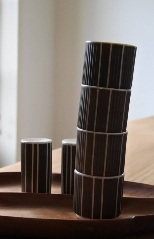 Het Arzberg Delphi servies is een modernistisch ontwerp uit de jaren 60. Het design heeft een verticaal ribpatroon in donkerbruin dat wordt onderbroken door een witte strepen door de onderzijde van wit porselein.