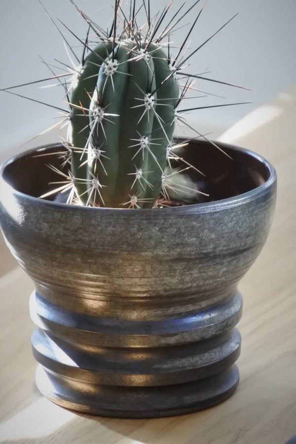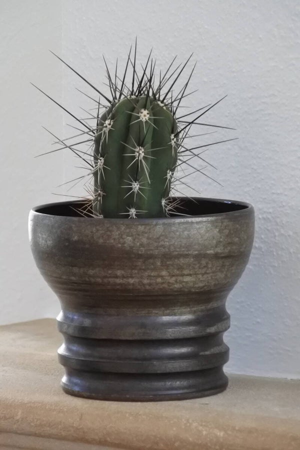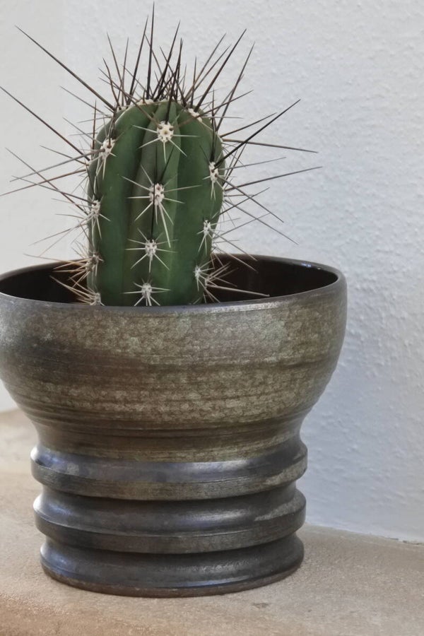 Mooie vintage bloempot van keramiek in een prachtige gemeleerde groene kleur met een vleugje metallic. De pot heeft een stoere structuur en een tijdloos design. Echt een mooierd deze pot!