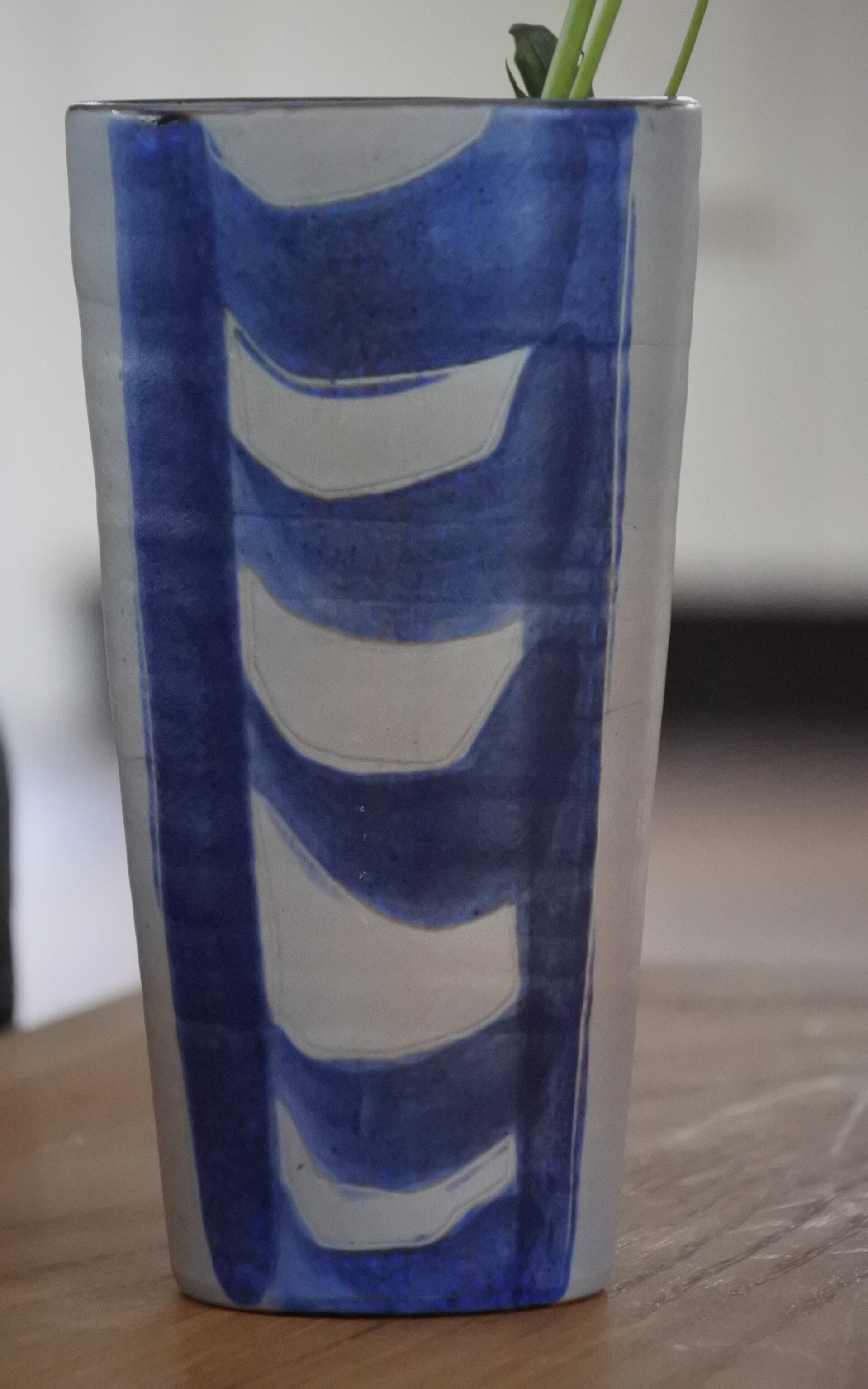 Mooie vintage vaas van Hollandse design bodem Ambacht Volendam in grijs met prachtig blauw decor.
