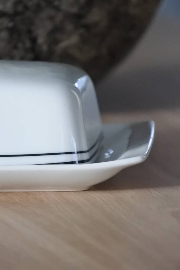 Vintage Art Deco stijl botervloot van Bavaria Arzberg Germany in wit met opdruk in zwart.