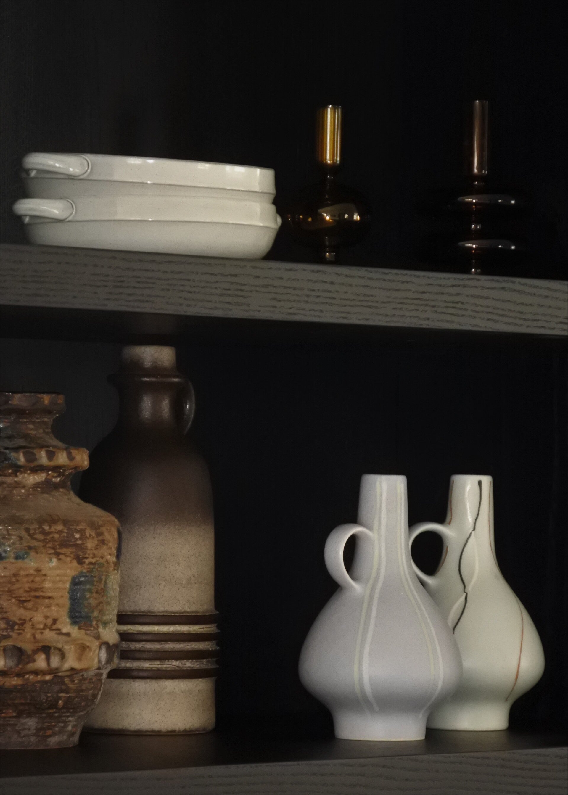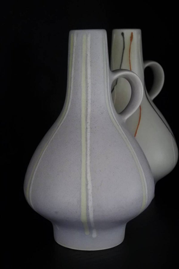 Handbeschilderd en zeldzaam vintage vaasje van West Germany gemaakt door de Duitse firma Dümler en Breiden. Deze vaas is een typisch jaren 50/60 abstract model maar staat met zijn tijdloze design en zachte kleuren in grijs met opdruk in wit en zachtgeel perfect in een hedendaags interieur. Een echt blijvertje dus!