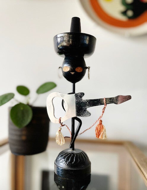 Het hoofd, de hoed en de figuurbasis zijn gemaakt van hout en het lichaam is gemaakt van metaal. Het buikje heeft een klein magneetje waar de gitaaropener aan blijft hangen.