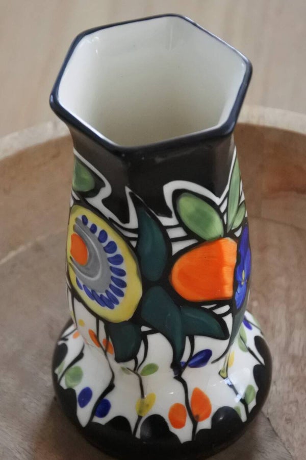Dit antieke art deco vaasje is van Ditmar Urbach uit de jaren 30 en is waanzinnig mooi met de hand beschilderd op een zwarte ondergrond. Aan de onderzijde gesigneerd.