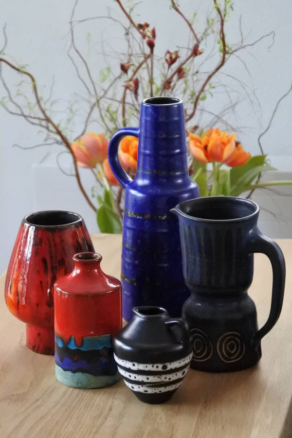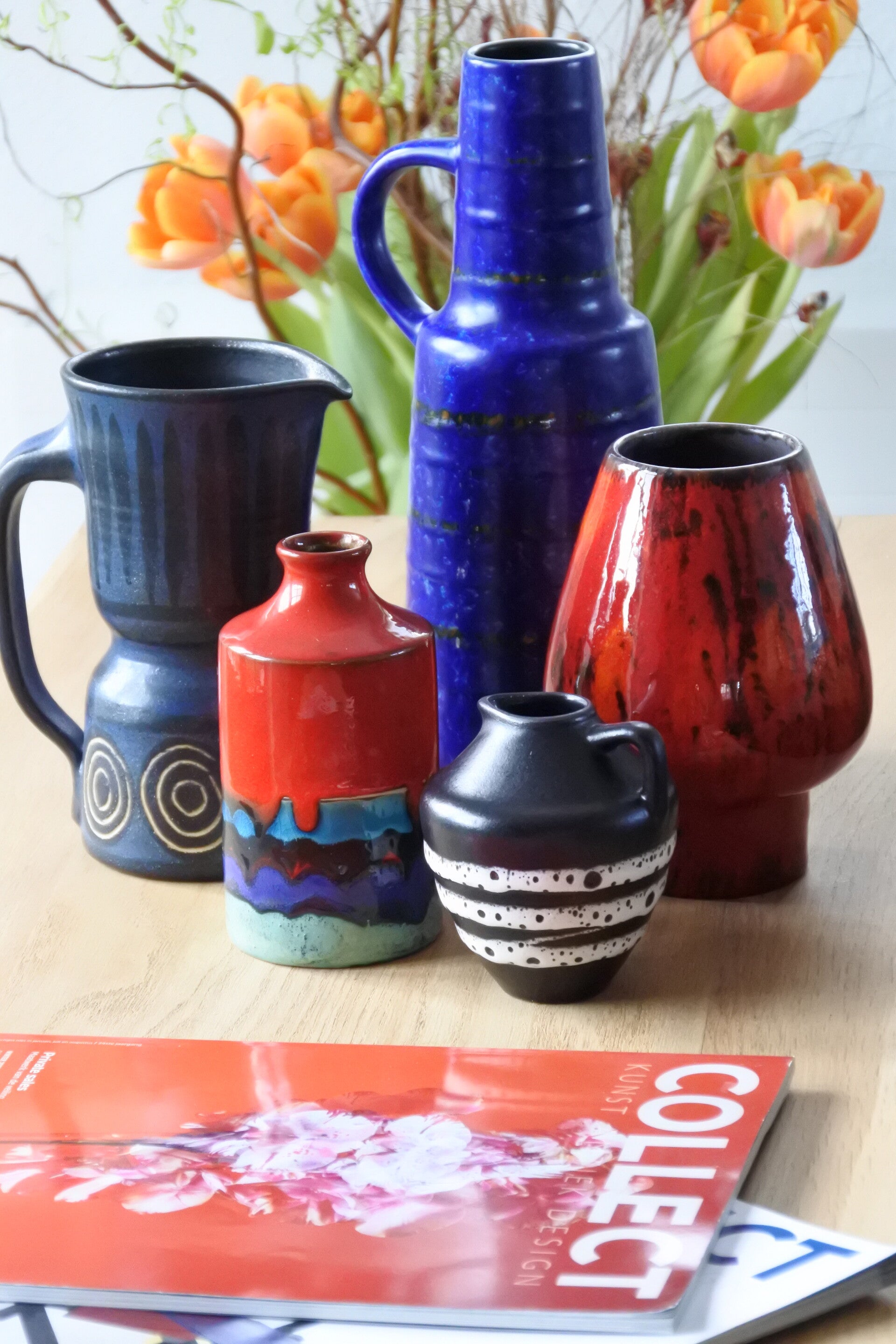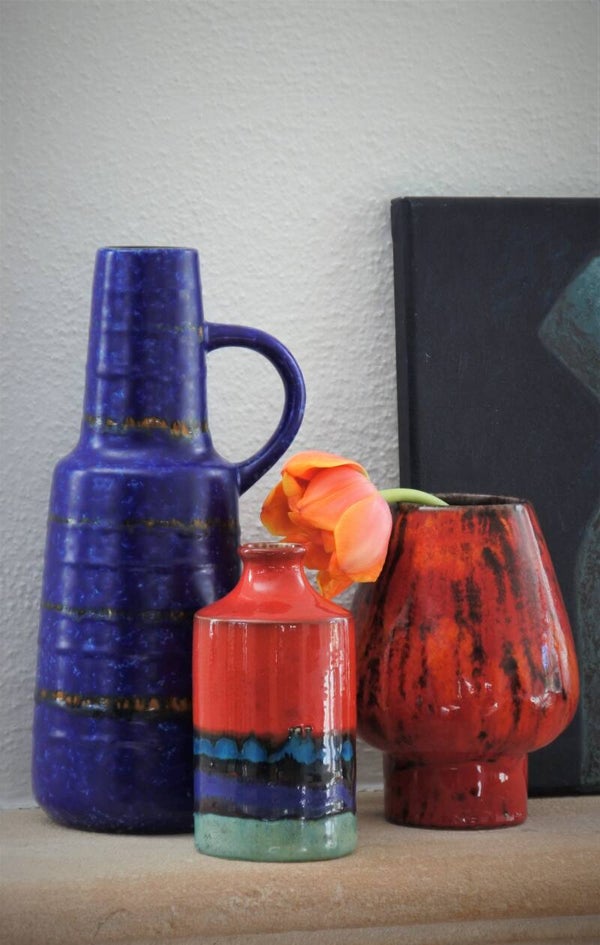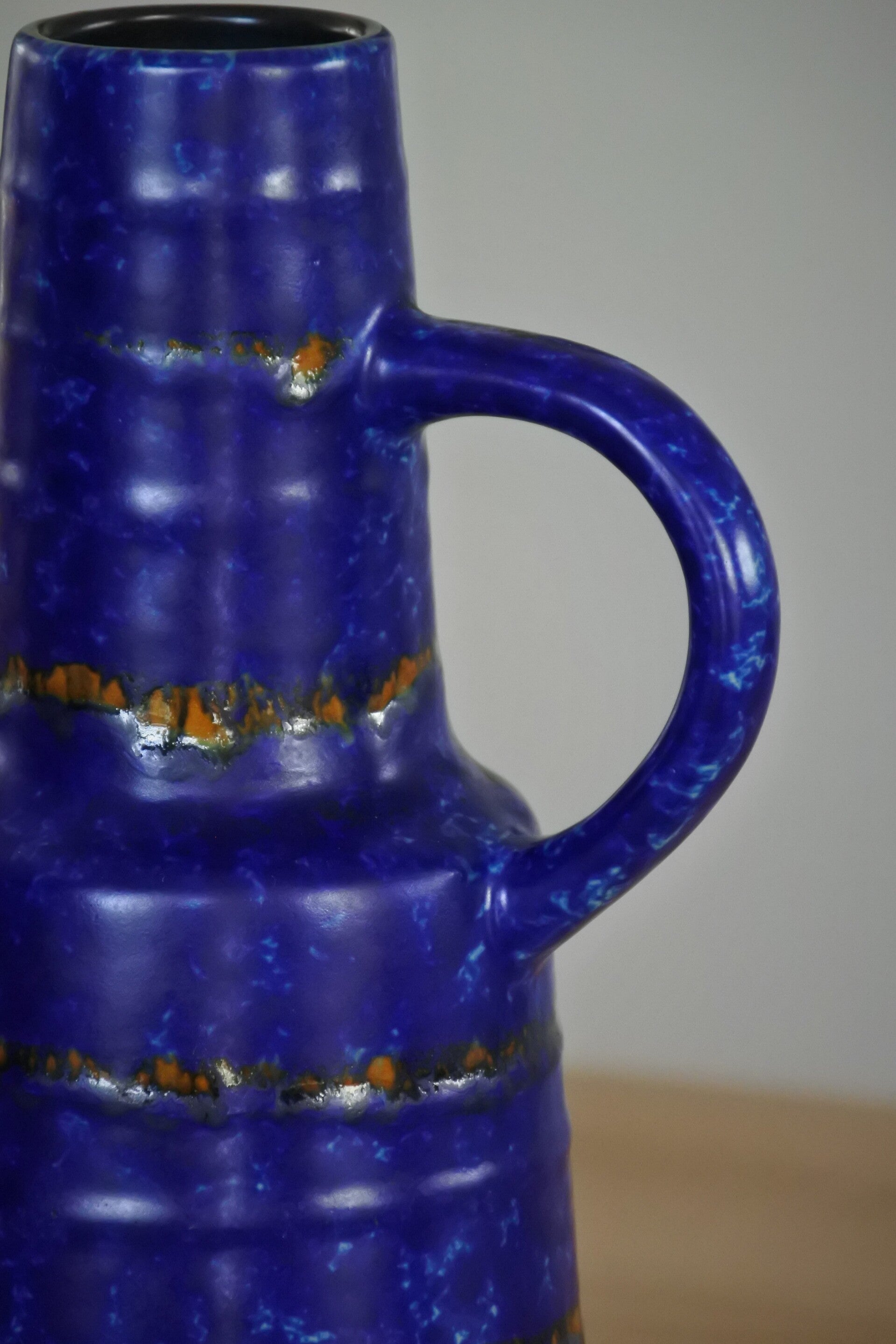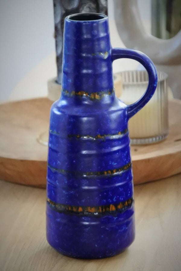 Deze zeldzame West Germany vaas van VEB Haldelsleben uit de 60's is een ware beauty te noemen met zijn koningsblauwe kleur en goudgele accenten.
