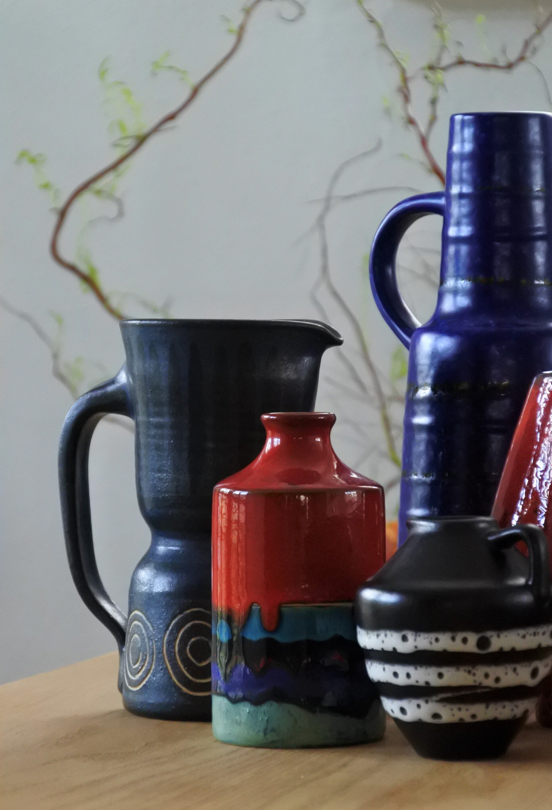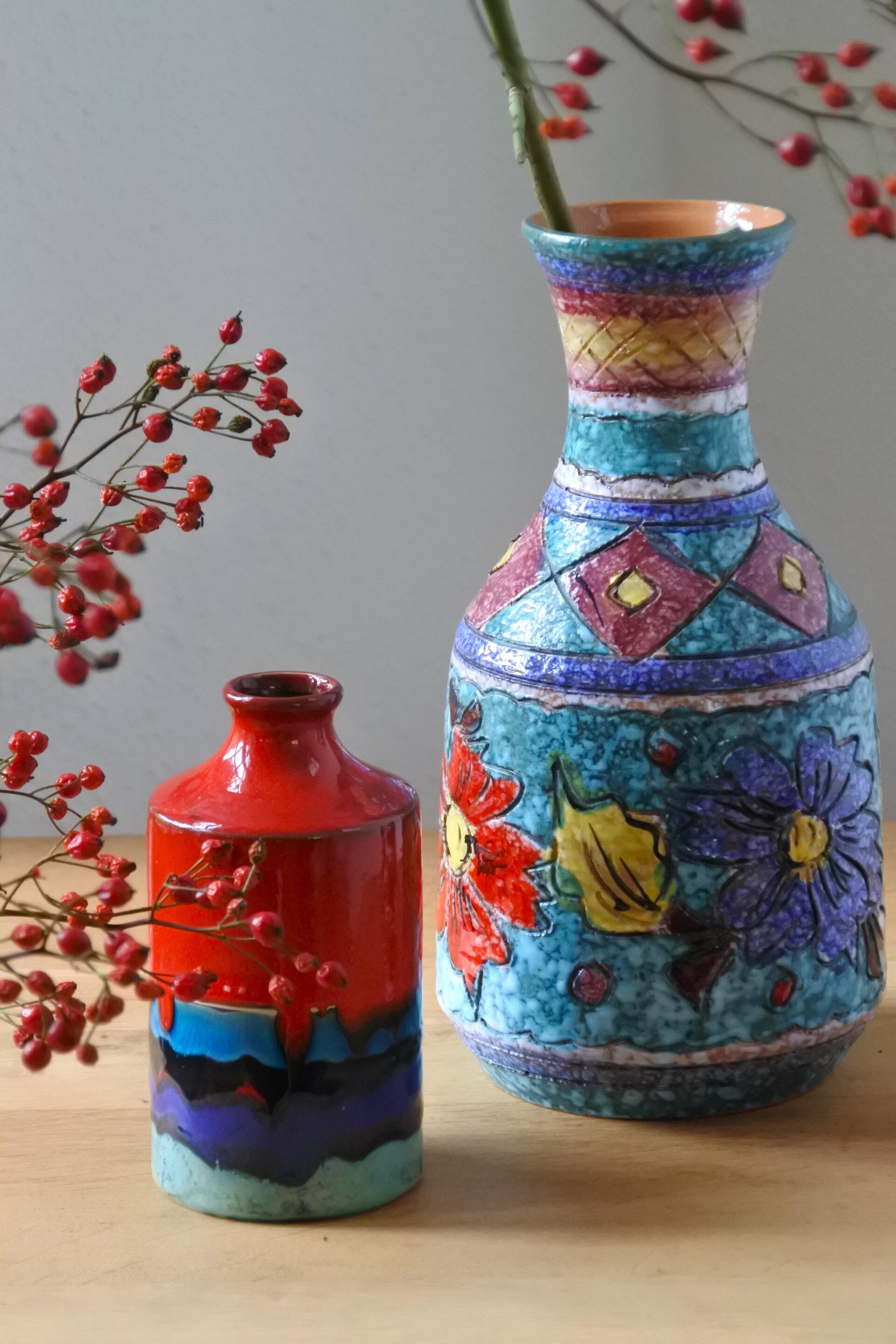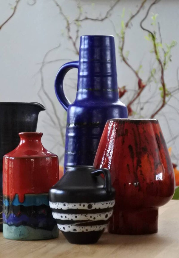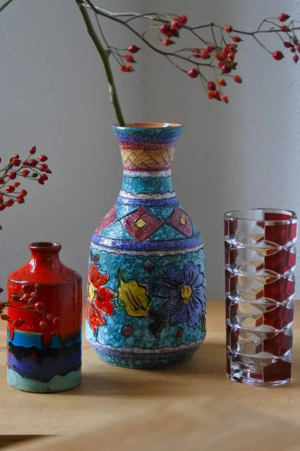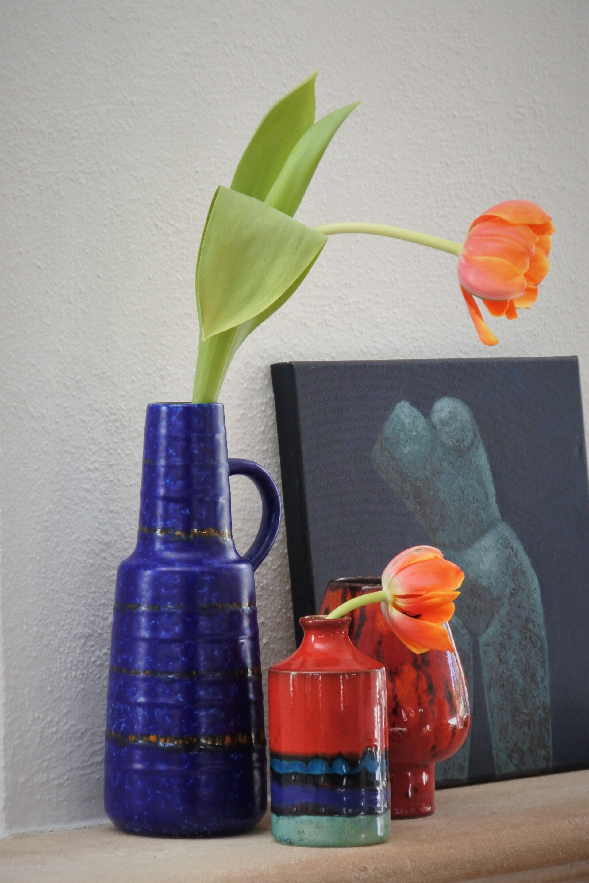 Super mooi West Germany vaasje met funky kleurgebruik in rood, licht- en kobaltblauw, zwart en groen.