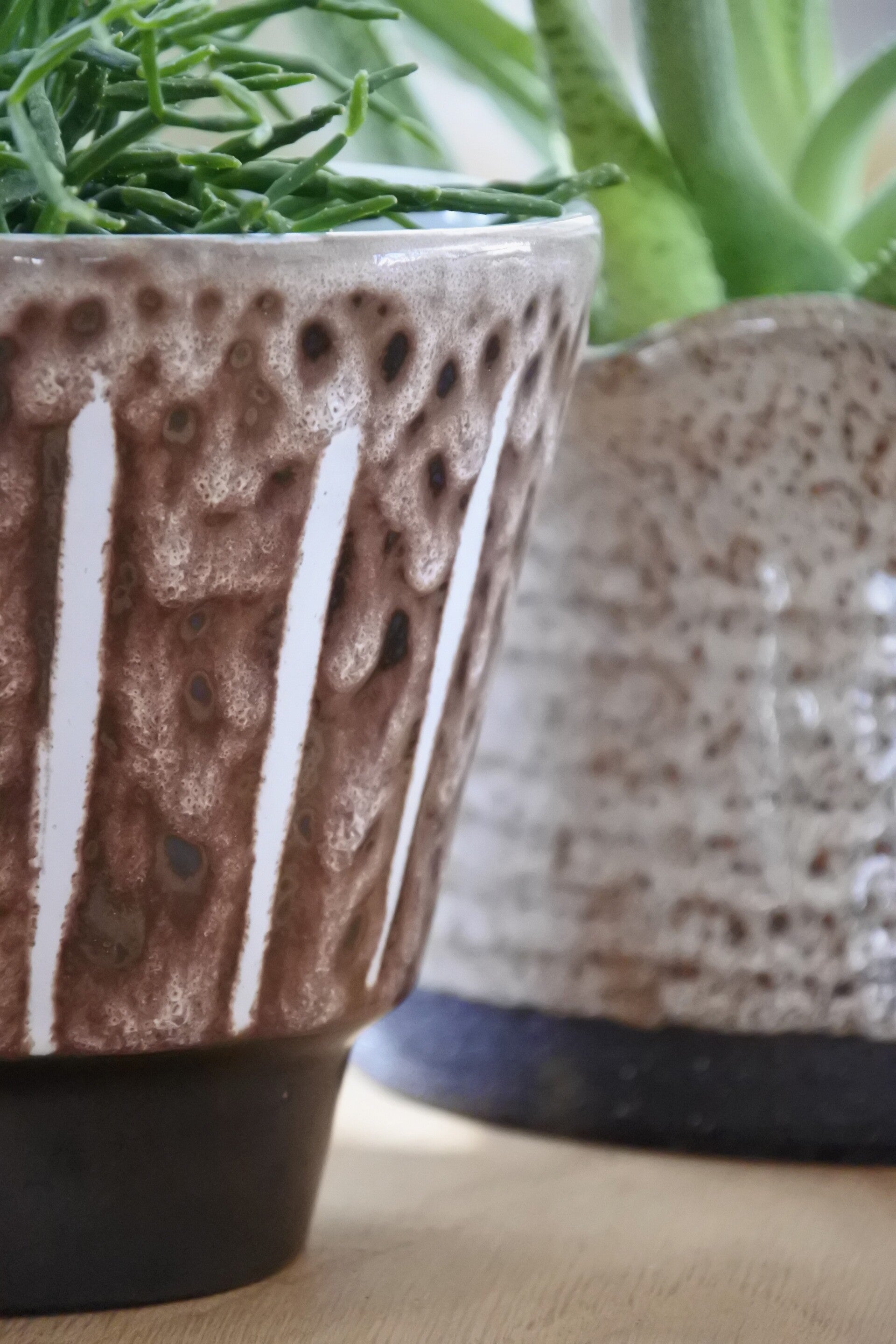 Prachtige Deense vintage bloempot met een mooi bruisglazuur op een donkerbruine ondergrond en krullende randen aan de bovenzijde. Gesigneerd aan de onderzijde; Denmark.