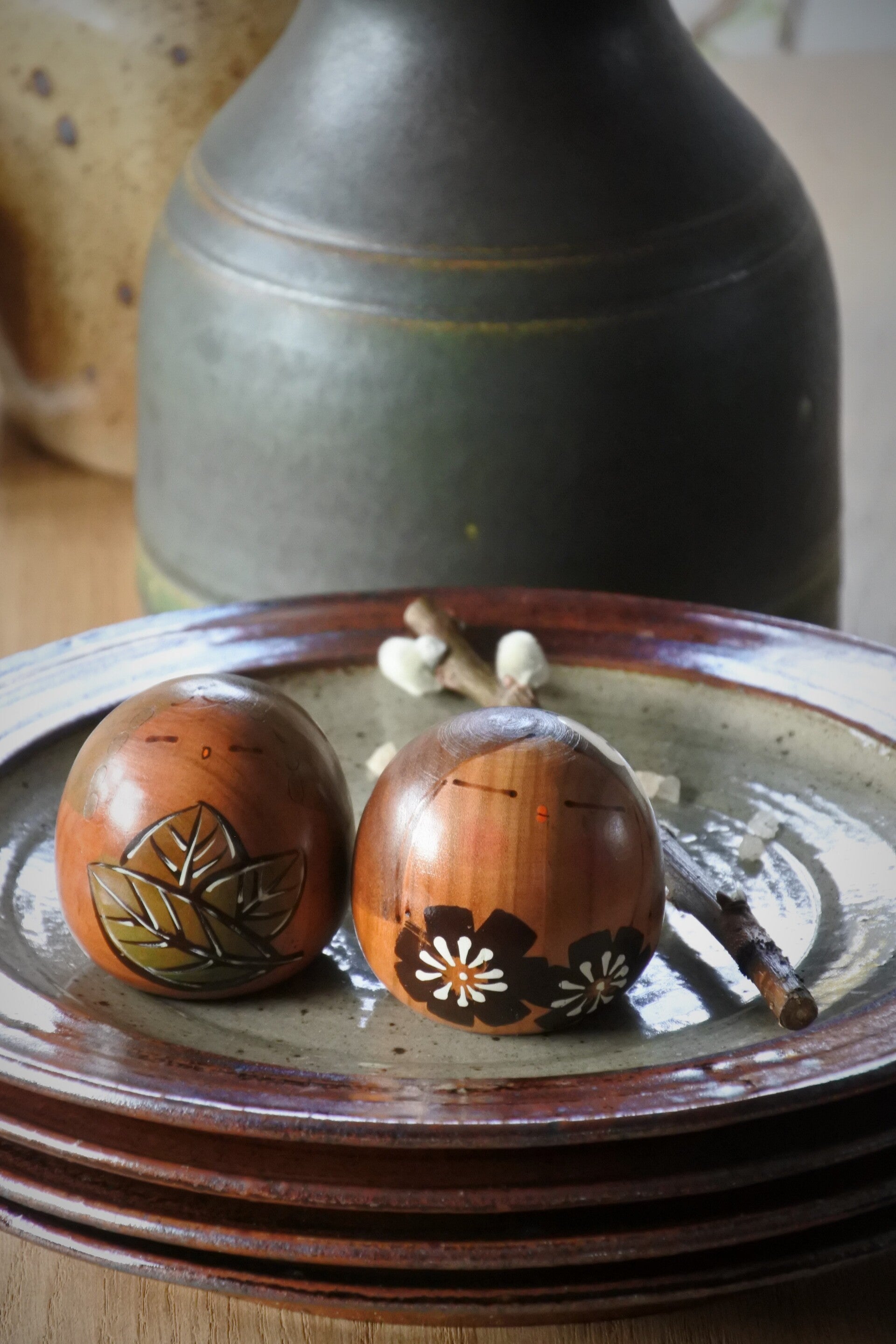 Prachtig vintage setje van 2 houten Kokeshi beeldjes van hout vervaardigd uit 1 stuk. De beeldjes zijn handbeschilderd. Deze mooie beeldjes schreeuwen toch om een mooi plekje?