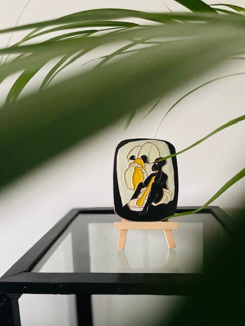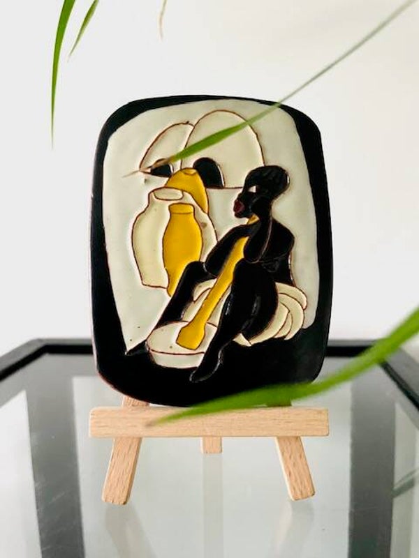 Prachtig siertegeltje uit de 60's van de firma Gamma Sierkeramiek (gemarkeerd op de achterkant) met hierop een afrikaans tafereel uitgebeeld. Deze vintage tegeltjes werden gemaakt in de jaren 60 en zijn zeer gewild als collector item omdat je ze simpelweg niet vaak voorbij ziet komen. Klein maar fijn en ook nog iets speciaals dus!